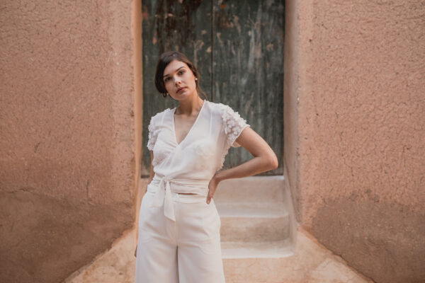 En crêpe georgette vaporeux, cache-cœur, broderie de fleurs au dos et manches courtes, non doublé.