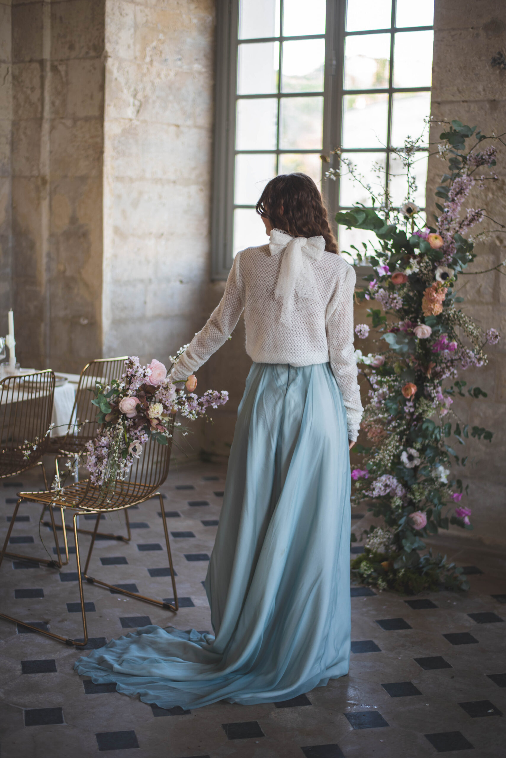 Coupe droite, tout doux, se porte un peu loose, manches longues froncées, col en dentelle et se noue sur l’arrière.